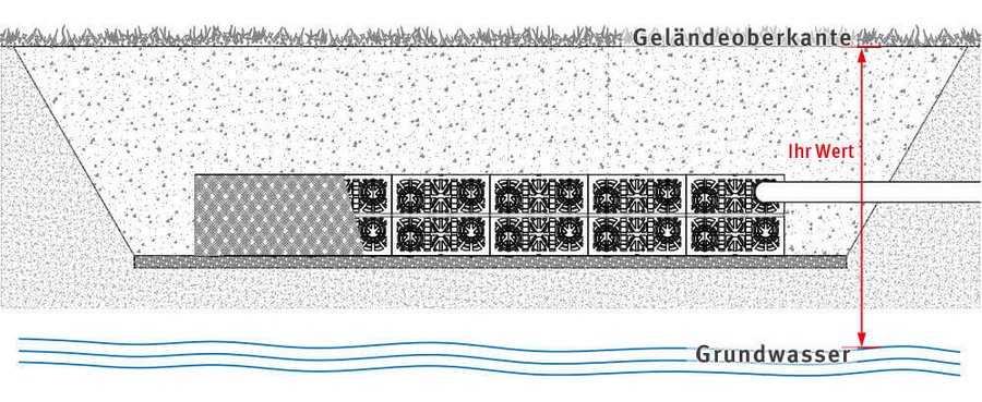 Das Versickerungssystem muss einen Mindestabstand von einem Meter zum Grund-/ Schichtenwasser haben. Entscheidend für die Einbautiefe der Versickerungsanlage ist der mittlere höchste Grundwasserstand. Dieser findet sich im Bodengutachten oder kann bei den örtlichen Behörden angefragt werden.